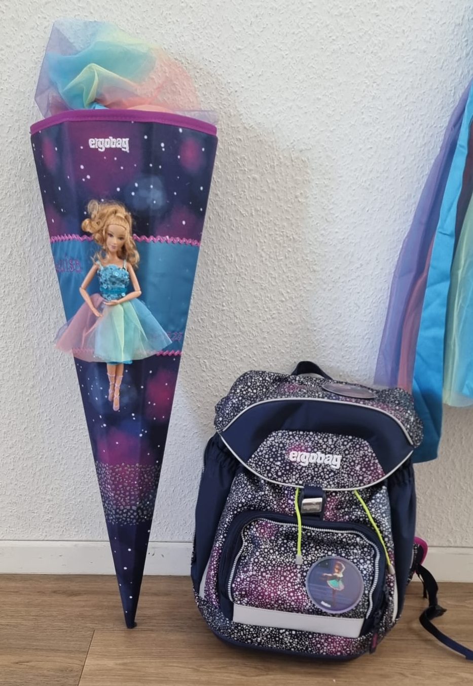 Hier habe ich eine fertig gekaufte Ballerinagirlande mit Schultüten nach Vorlagen von Bine Brändle kombiniert. Alles farblich auf lila, blau und grün abgestimmt.