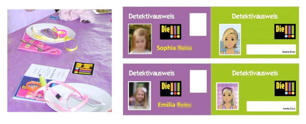 Zu einem richtigen Detektivgeburtstag gehört natürlich auch ein anständiger Detektivausweis, auf diem weißen Felder kommt noch ein Fingerabdruck und die Unterschrift der Kinder. Ich habe bunte Schlüsselbänder besorgt, von jedem Kind ein Paßbild „geordert“ und einlaminiert. Damals gab es den Kinofilm noch nicht und die Kinder kannten nur die Bücher und Hörspiele. Ich habe für jedes Kind auch passend zum Foto einen „Avatar“ generiert. Es gibt eine Handyapp von den drei Ausrufezeichen und damit kann man alle möglichen Figuren generieren und sich die Bilder dann selbst zuschicken.