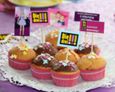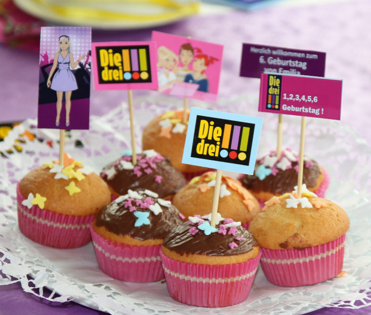 Muffins sind auf Kindergeburtstagen immer sehr beliebt – die passenden Stecker sind schnell gemacht: etwas farblich/thematisch passendes ausdrucken (hier mit einem Fotodrucker), ausschneiden und auf einem Holzspieß kleben. Das geht wirklich immer und macht viel her. Meine Kinder freuen sich auch über Fotos auf den Steckern.