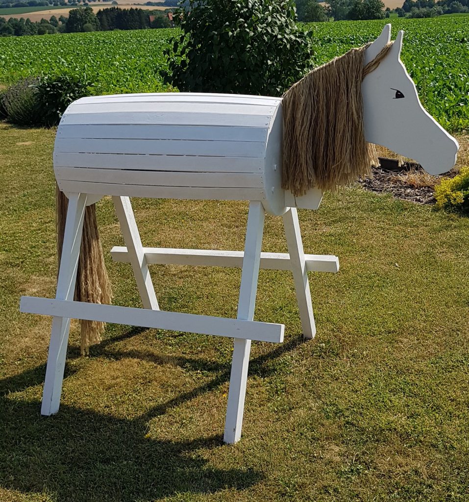 Ein „Pferd“ gab es natürlich auch für das Geburtstagskind aus Holz, einem Rolllattenrost und Sisalschnur. Das ist aber dann doch nicht mein Fachgebiet, das hat ihr Papa gebaut.