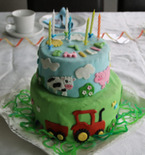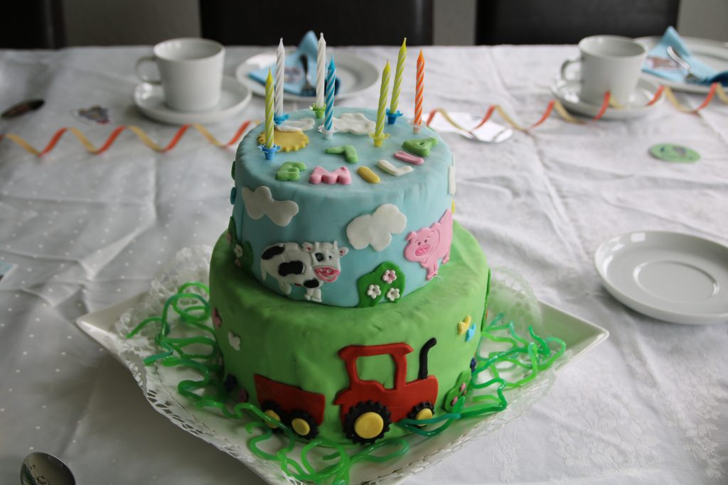 Ein ganz typischer Fondantkuchen, allerdings habe ich mit hier auch Ausstechförmchen für Tiere und Traktor besorgt.