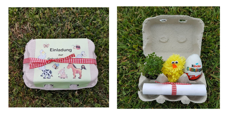 Für die Einladung haben wir leere Eierkartons besorgt und neu befüllt: mit einem kleinen Küken vom Geburtstagskind aus zwei gelben Wollpompons gebastelt, dem Einladungstext, einem Überraschungsei und einer Mini Kressepflanze, die für das dekorative Grün sorgte.