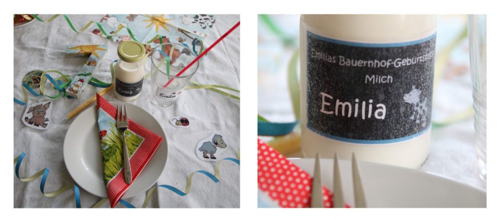 Für die Tischdeko haben wir niedliche Bauernhoftiere ausgeschnitten und auf dem Tisch als Streudeko verteilt. Dann durfte natürlich auch die obligatorische Milch nicht fehlen, da haben wir auf kleine Flaschen hübsche Etiketten geklebt und wer wollte konnte die Milch dann ja auch trinken. Für alle anderen gab es dann noch alternative Getränke.