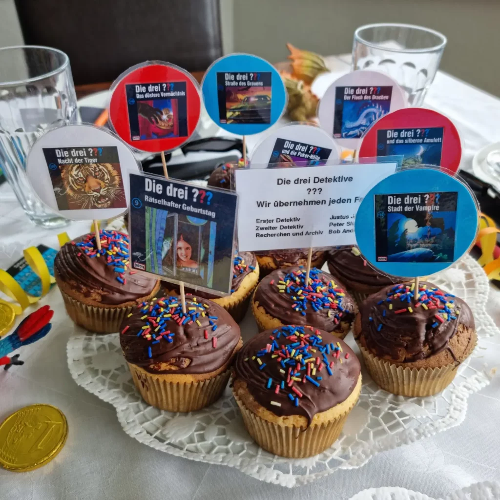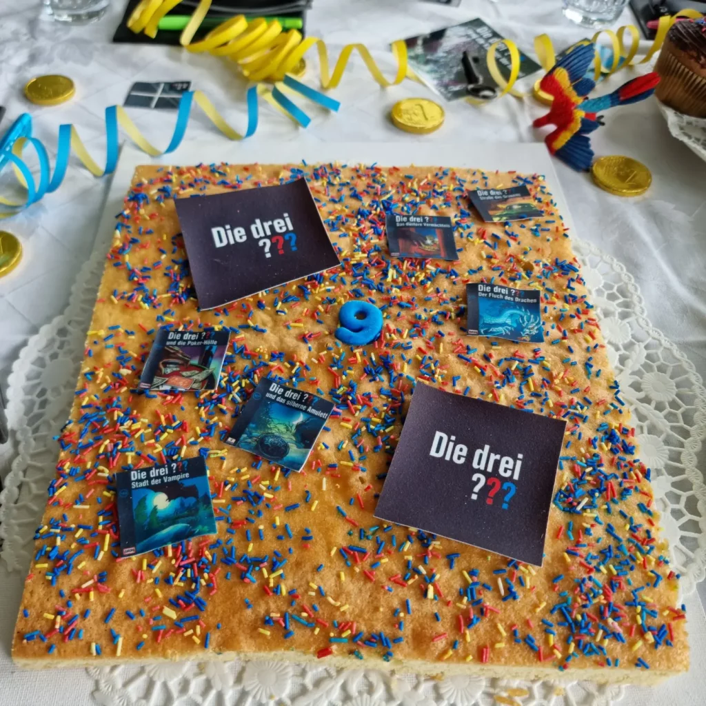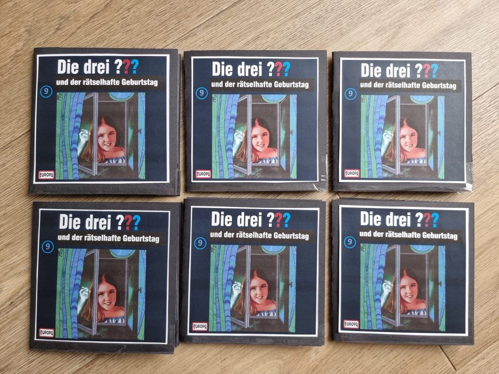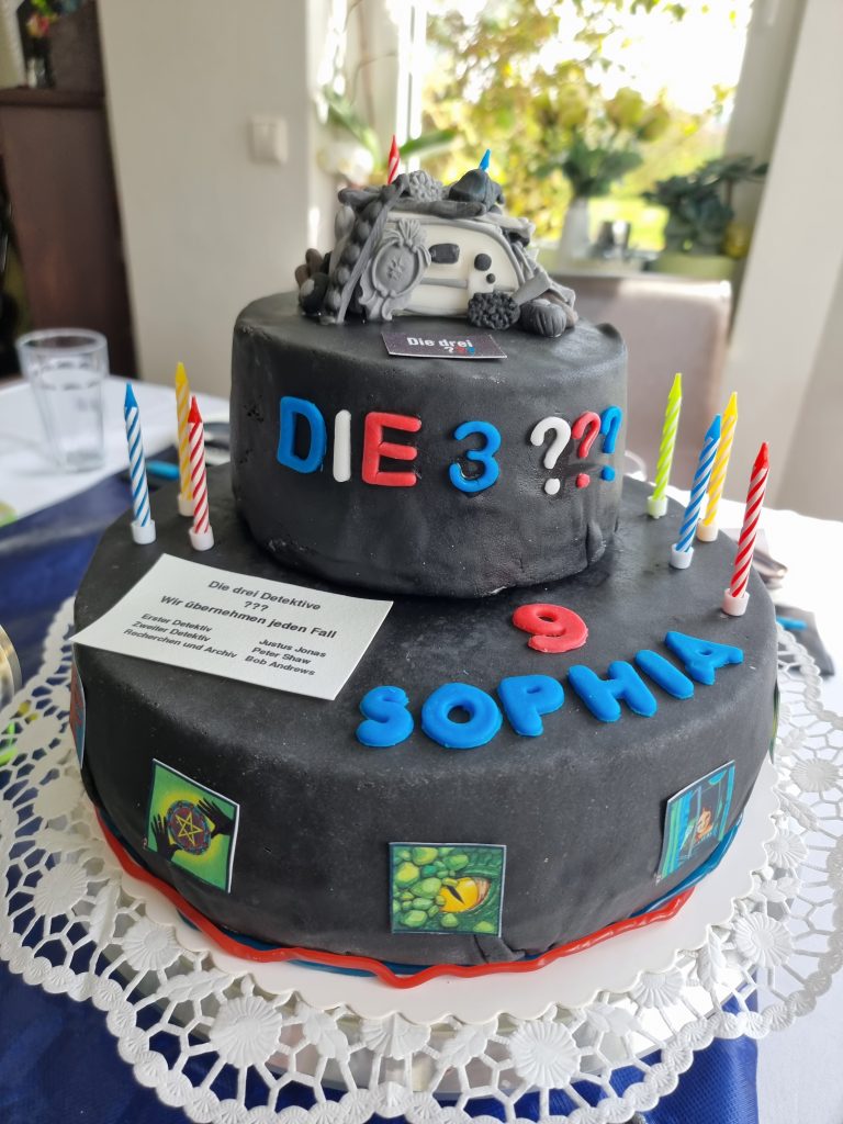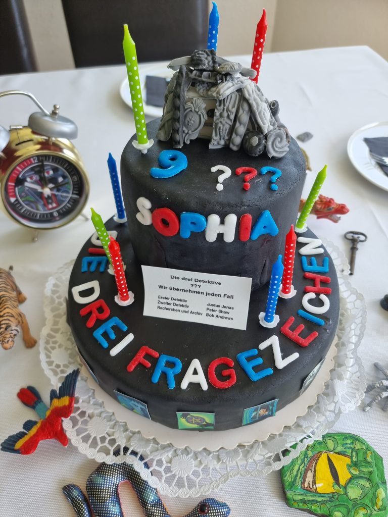 Auf dieses Motto hatte ich, so muss ich zugeben, doch schon ziemlich lange und geduldig gewartet. Schon mein Mann und ich haben als Kinder (und sogar noch später auf langen Autofahrten) die drei Fragezeichen gehört, so sind auch schon unsere Töchter irgendwie damit aufgewachsen. Ich selbst bin jetzt nicht so Fan der drei Fragezeichen Kids, aber als Einstieg für gerade kleinere Kinder gut geeignet. Sophia hat sich zu ihrem 9. Geburtstag ganz viele Bücher der drei Fragezeichen gewünscht – sie mag sowohl die Kids als auch Klassiker gleichermaßen – und sogar in der Schule schon ein Plakat mit einer Buchvorstellung gemacht. So war es für mich dann klar, was das nächste Geburtstagsthema wird.