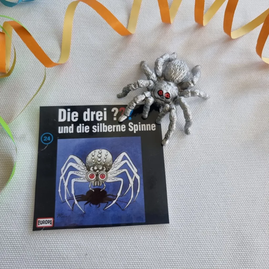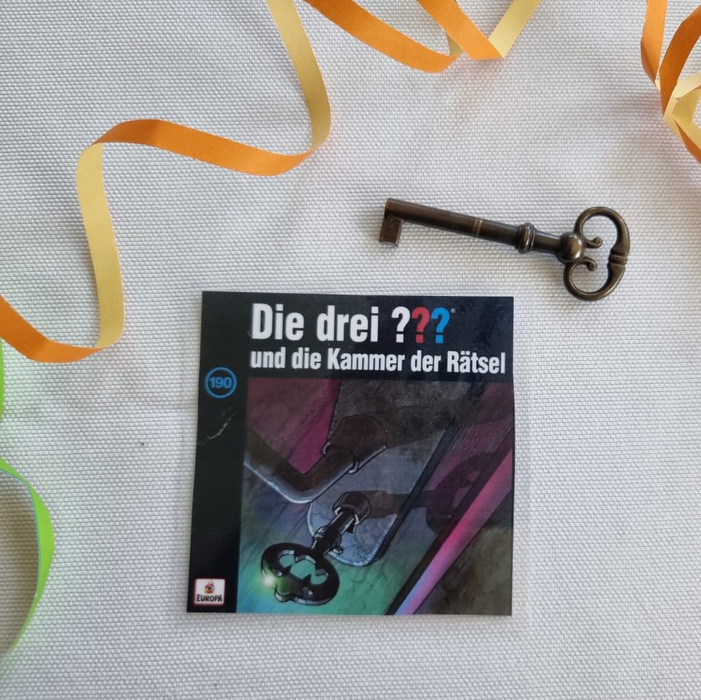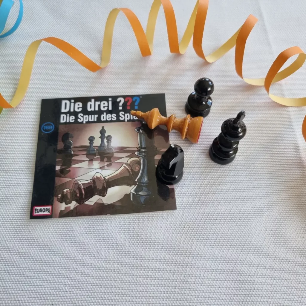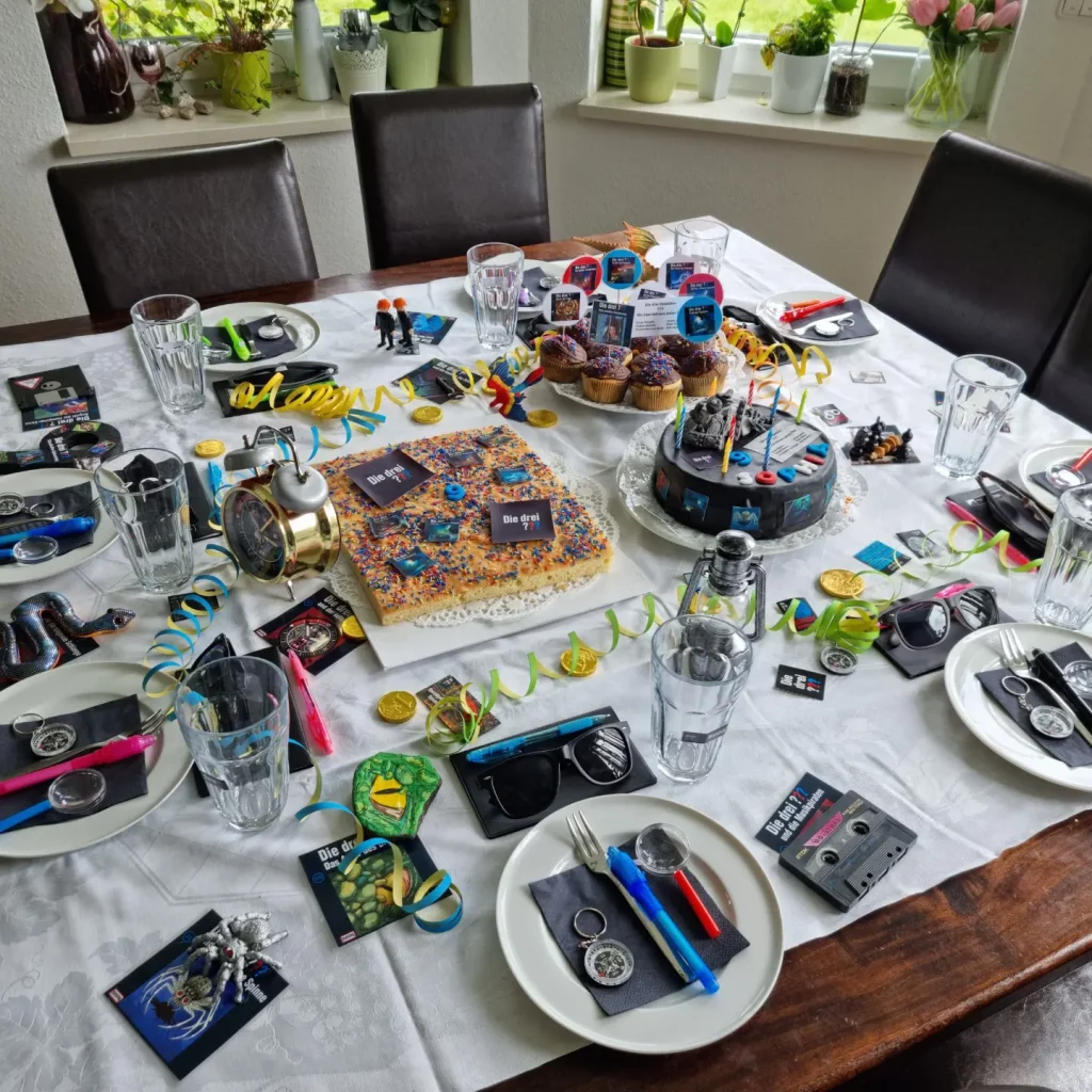 Die Tischdeko hat uns wirklich am meisten Spaß gemacht, wir haben ja das große Coverpuzzle der drei Fragezeichen und viele Bücher… Was kann man wie darstellen? Welche Folgen mögen wir ganz besonders?  Es ist gar nicht so einfach zwei absolut identische Playmobilfiguren zu finden, aber auf einem Flohmarkt sind wir dann fündig geworden, die Karten und der Schlüssel auch ganz einfach. Unsere absoluten Lieblingscover sind aber das Drachenauge (von mir selbst auf einen Stein abgemalt) und der Wecker, wo wir bei einem alten Kinderwecker das Ziffernblatt ausgetauscht haben.