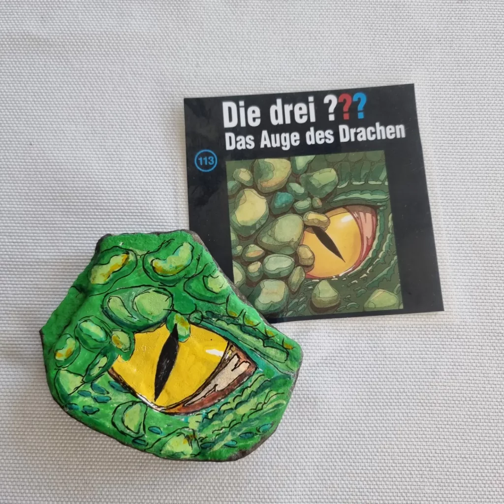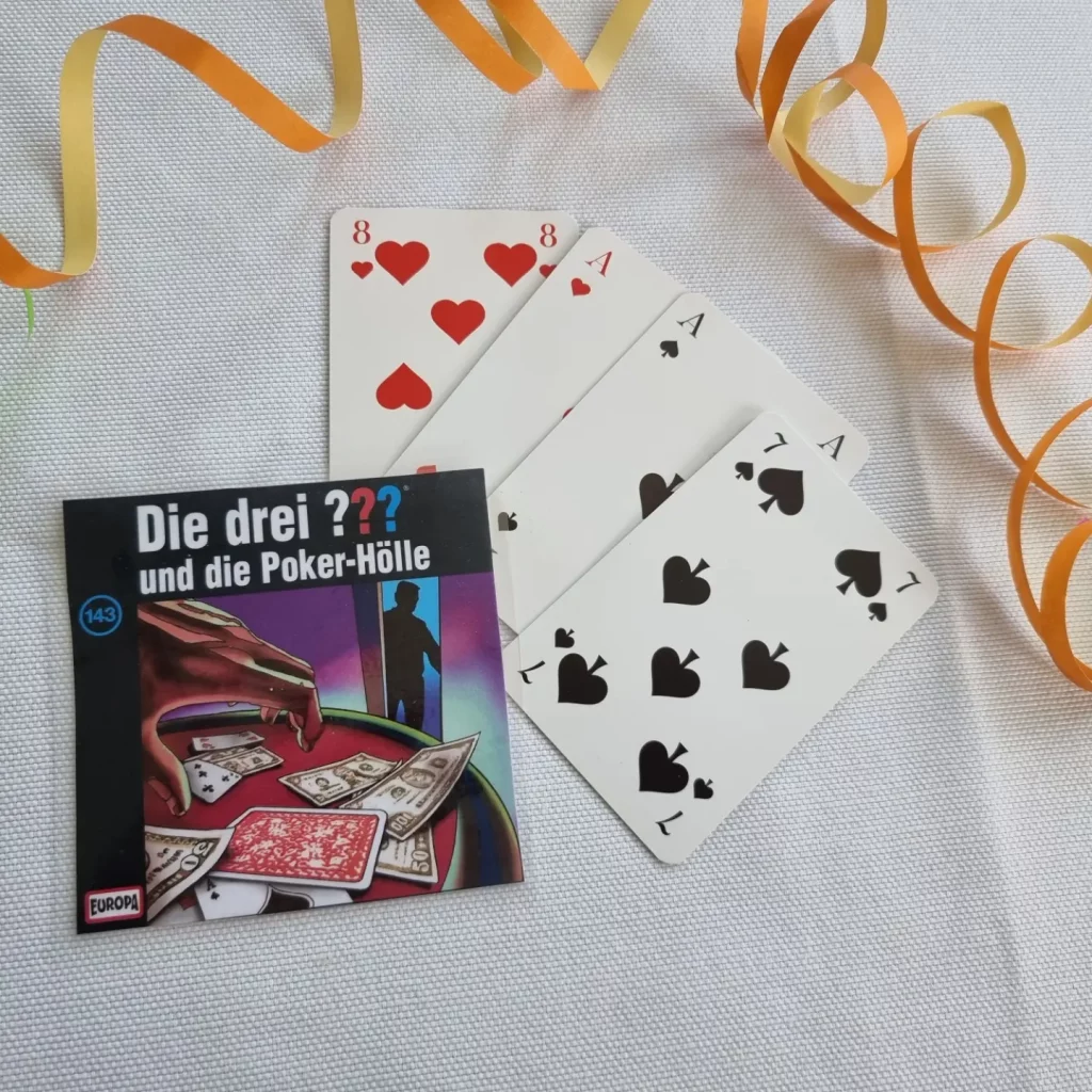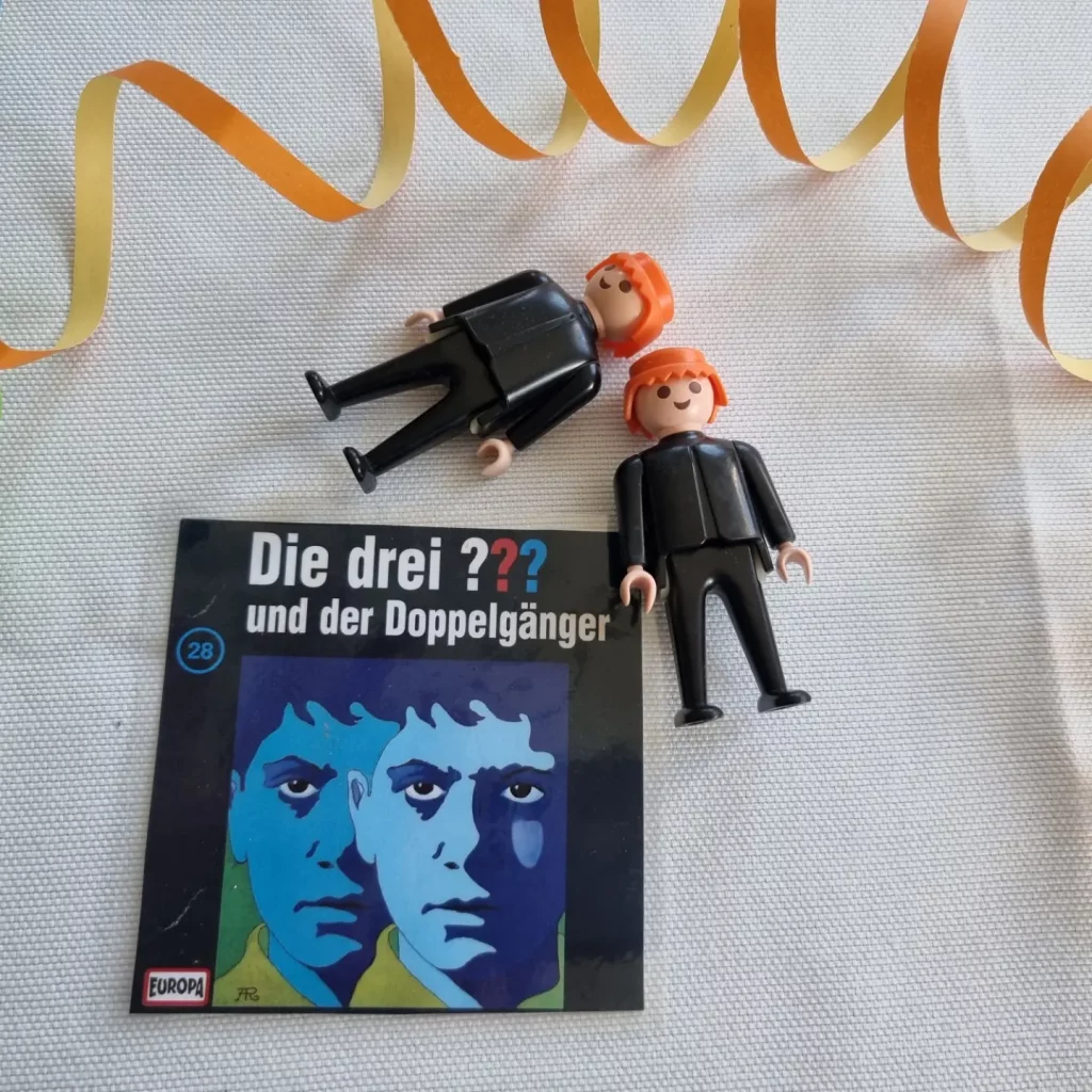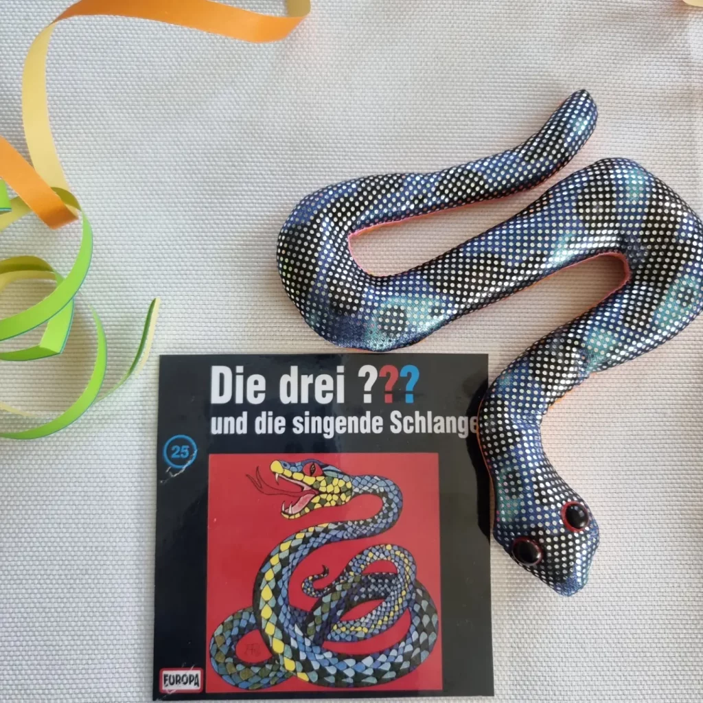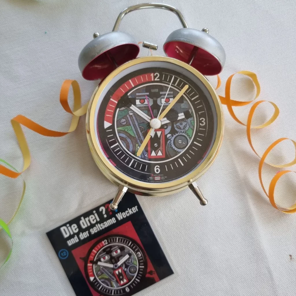 Die Tischdeko hat uns wirklich am meisten Spaß gemacht, wir haben ja das große Coverpuzzle der drei Fragezeichen und viele Bücher… Was kann man wie darstellen? Welche Folgen mögen wir ganz besonders?  Es ist gar nicht so einfach zwei absolut identische Playmobilfiguren zu finden, aber auf einem Flohmarkt sind wir dann fündig geworden, die Karten und der Schlüssel auch ganz einfach. Unsere absoluten Lieblingscover sind aber das Drachenauge (von mir selbst auf einen Stein abgemalt) und der Wecker, wo wir bei einem alten Kinderwecker das Ziffernblatt ausgetauscht haben.