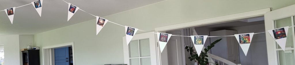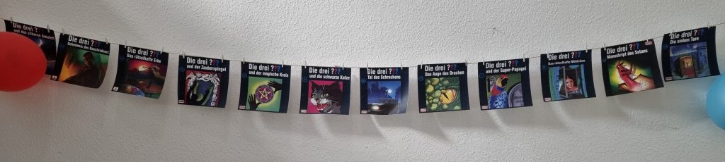 Eine weiße (fertig gekaufte) Wimpelkette mit aufgeklebten Ausdrucken der Cover. Zu den drei Fragezeichen Kids gibt es ja ausreichend fertige Deko zu kaufen, aber ich wollte ja die „Klassiker“ und so geht es ja auch.