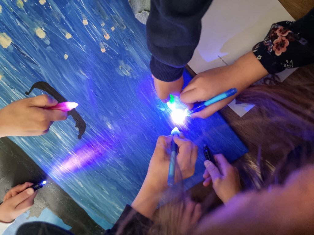 Der nächste Hinweis war das miteinem UV-Stift geschiebene Wort „Trampolin“. Dort fanden die Kinder einen Umschlag mit einem Puzzle. Ursprünglich wollte ich auch noch Puzzleteile mit in die Einladung packen, das habe ich dann aber irgendwie vergessen – was aber keiner bemerkt hat.