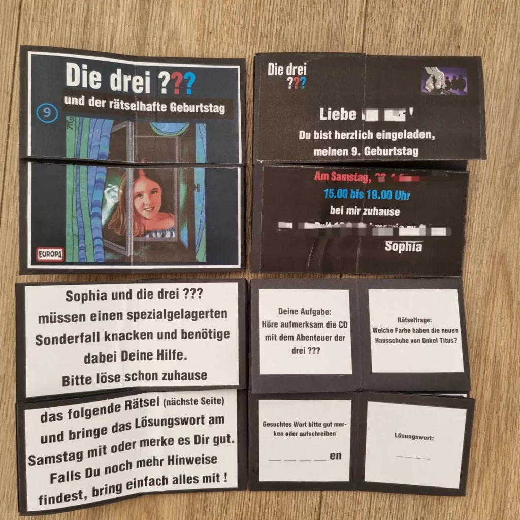 Wer sich schon mehrere meiner Einladungen angesehen hat, wird erkennen, dass wir hier wieder eine Endloskarte genutzt haben, aber sie ist auch zu schön. Da hatten wir dann auch genug Platz für den Einladungstext und das Rätsel. Für jedes Kind gab es ein anderes Lösungswort, genau auf den entsprechenden Fall in der CD zugeschnitten. Die Lösungswörter aller Gäste ergaben dann einen Satz, der zum ersten Hinweis bei unserer Schnitzeljagd führte.