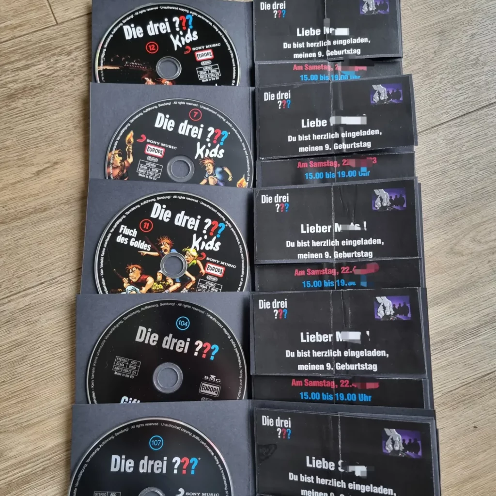 Die Idee mit der CD habe ich auch im Internet gefunden und so haben wir erstmal eine Papierstecktasche, also etwas für die CD und das Booklet gebastelt, das Cover sollte natürlich natürlich auch typisch und passend für das Geburtstagskind sein. Nr. 9 natürlich wegen 9. Geburtstag. Da ich leider nicht so toll malen kann, dafür aber inzwischen ziemlich geschickt mit Fotomontagen bin, habe ich mich kreativ am Computer betätigt. Wenn man sich auskennt, erkennt klar das benutzte Cover, echte Fans mögen mir das verzeihen. Das Bild meiner Tochter habe ich mit der App Toon-me bearbeitet und eingefügt. Die CDs habe ich günstig auf einem Flohmarkt erstanden und entsprechend Alter und Vorwissen der Gäste, die verschiedenen CDs zugeordnet, jeder Gast hatte eine andere CD in seiner Einladung.