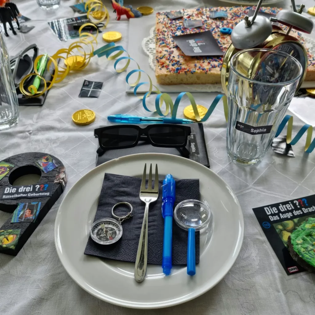 Bei uns geht der erste Blick der Gäste ja meist schon zum fertig gedeckten Tisch, wo die Vorfreude auf die Party dann nochmal richtig steigt. Das Geburtstagskind steht zwar im Mittelpunkt, allerdings kommen unsere kleinen Gäste auch niemals zu kurz. Hier ist schon alles vorbereitet, was später noch wichtig wird: ein kleiner Kompass, eine UV Lampe, Lupe, Notizblock und Stift. Und natürlich eine Sonnenbrille, das ist zwar eher nicht drei Fragezeichen, aber trotzdem cool.