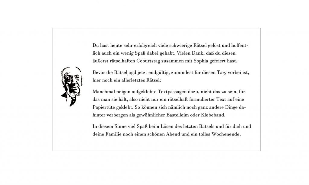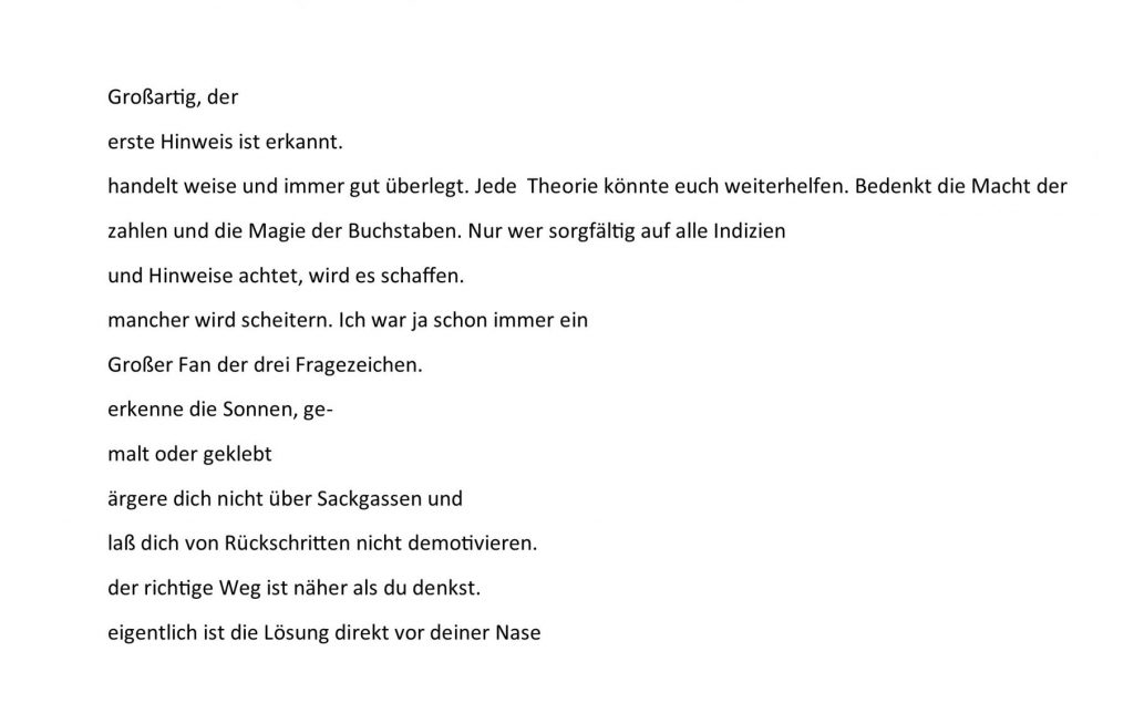 Unter dem Blumentopf war das nächste Rätsel, ein ziemlich verwirrender Text: