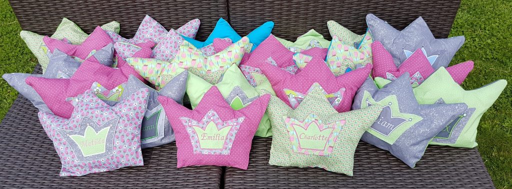 Wir hatten ja noch die ITH-Datei für die Stickmaschine mit den Krönchen, da die Kinder diesmal schon etwas älter waren und mit kleinen Puppenkissen nicht mehr soviel anfangen konnten, habe ich mit der Stickmaschine eine Applikation mit Namen gezaubert und dann ein einfaches Kissen dazu genäht.