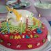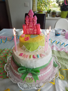 Die Torte dreistöckig und mit einem Schloss gekrönt, diesmal mit Teich. Die Schleife ist aus diesen leckeren sauren Bändern .