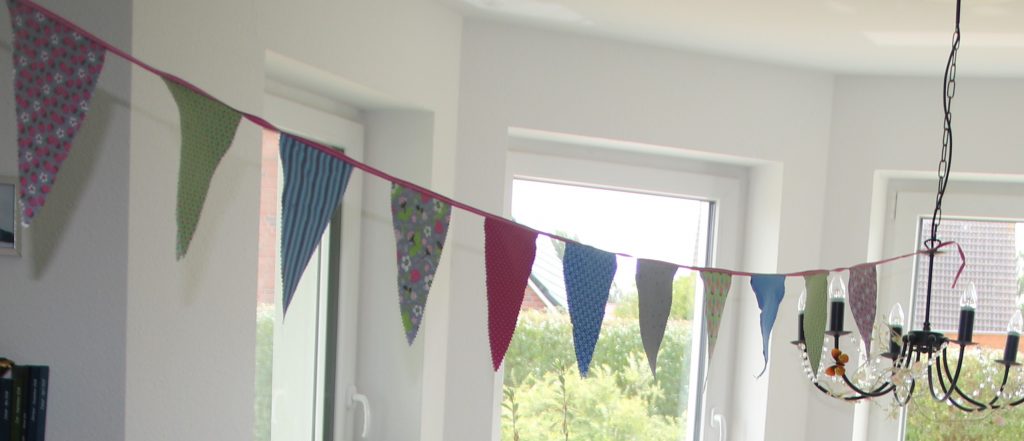 Aus den Stoffresten, die nach den Kissen noch übrig waren, habe ich noch schnell eine Wimpelkette genäht. Ich habe die Wimpel mit einer Zickzackschere ausgeschnitten und links auf links mit Stoffkleber geklebt. Die „Leine“ ist ein Saumband.