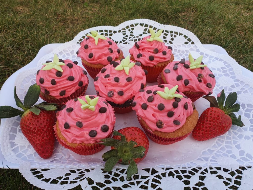 Das Frosting wurde mit roter Lebensmittelfarbe eingefärbt und mit Schokotröpfchen garniert. Die „Blätter“ sind aus grünem Fondant.