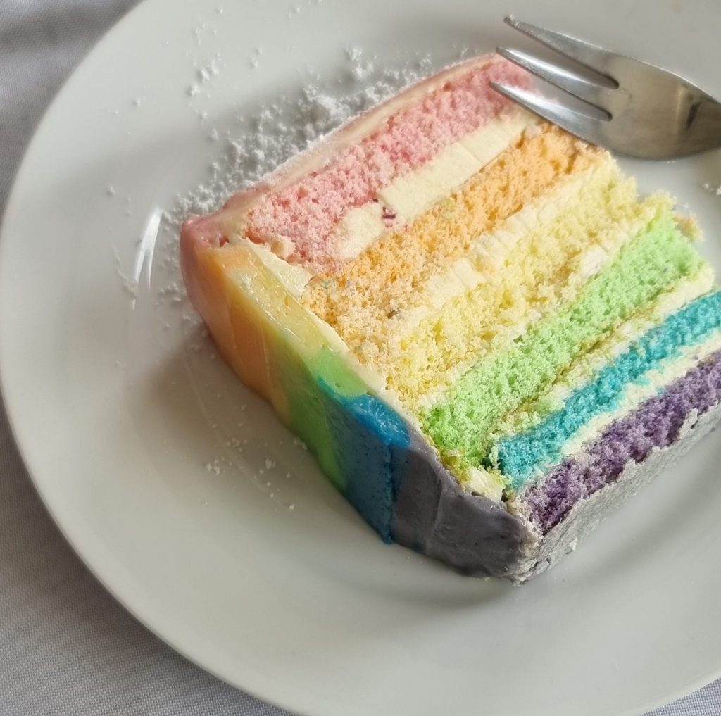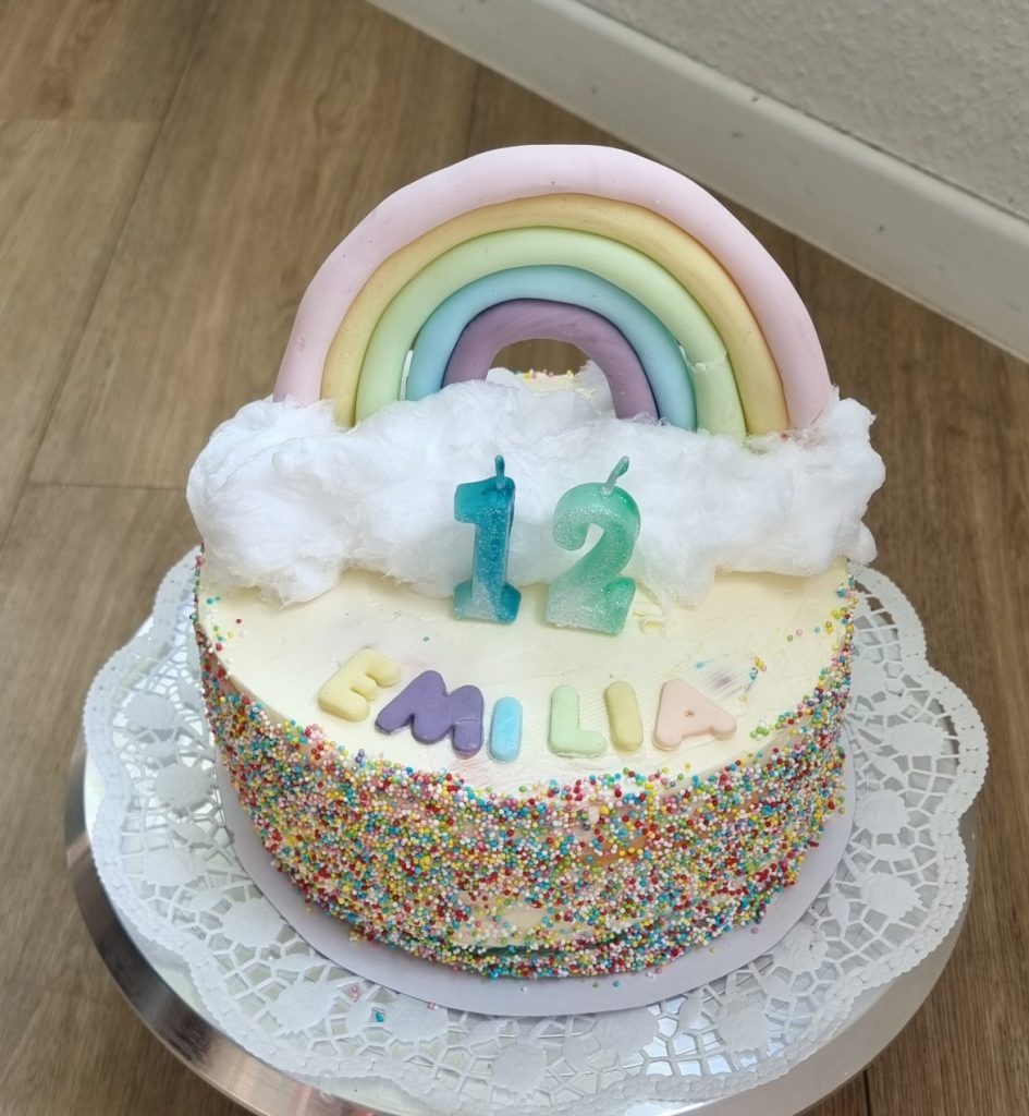 Der erste Versuch einer Regenbogentorte in diesem Jahr, die Zuckerwatte ich am besten angekommen und den Regenbogen hatte ich schon Wochen vorher aus Fondant gefertigt, damit er dann auch nicht umfällt, weil er zu weich ist. Rechts und links sind aber auch Zahnstocher.
