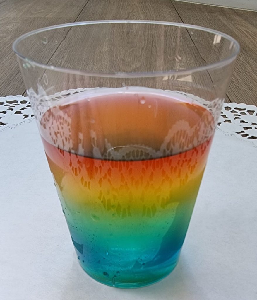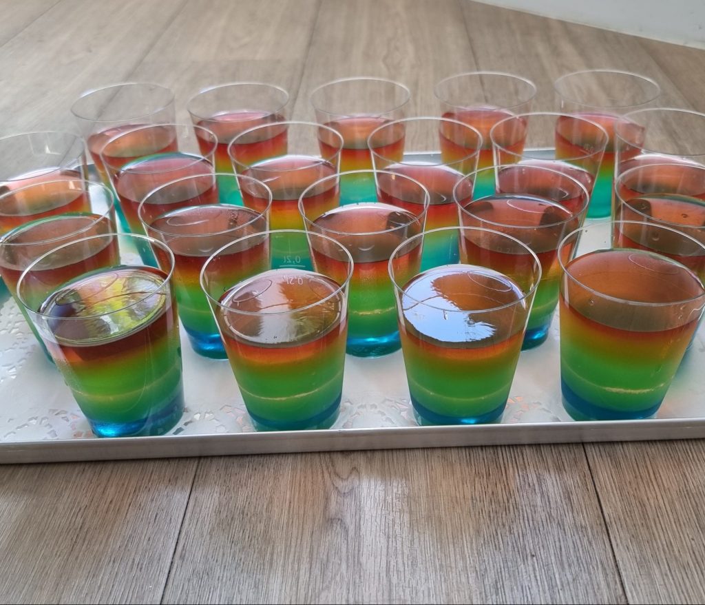 Götterspeise mit Vanillesoße (und ohne !) geht anscheinend immer. Da braucht man in der Vorbereitung nur etwas Geduld und Platz im Kühlschrank. Das Blau habe ich mit Sprite, blauer Lebensmittelfarbe und AgarAgar hinbekommen.