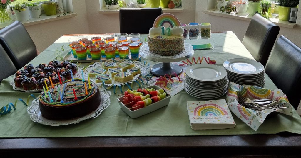 Dieses Thema für einen 12. Geburtstag war eigentlich eher ein „Notfallplan“, denn unser Garten war in diesem Sommer eine einzige Baustelle und während der Geburtstagsplanung hatten wir keine Ahnung wie weit wir dann tatsächlich sind und welche Bereiche des Gartens überhaupt genutzt werden können. Irgendwie kamen wir dann auf ihre Lieblingsfarben und dass sie eigentlich alle Pastelltöne sehr gerne mag. So hatten wir dann immerhin auch schon ein Farbkonzept und waren schnell beim Thema Regenbogen. Die eigentliche Herausforderung war dann aber eine Party für fast zwei Dutzend 12-jährige Kinder zu organisieren.