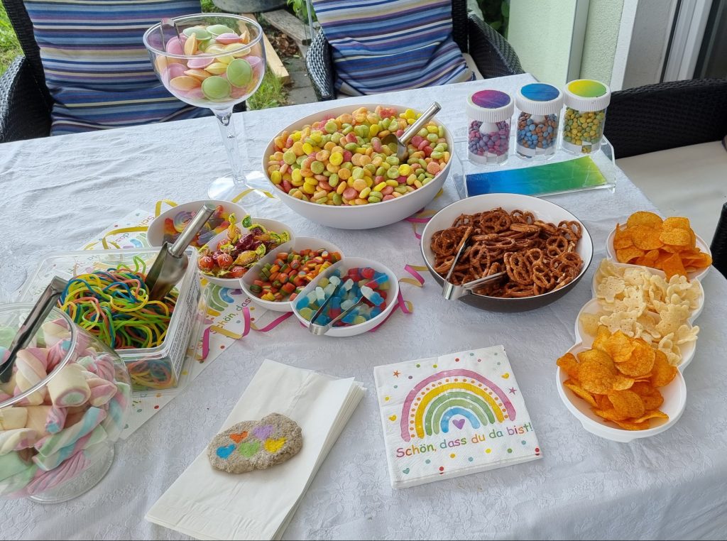 Eine Candybar mit Chips usw. durfte natürlich auch nicht fehlen. Ich hatte noch kleine Papiertütchen dazugelegt, wenn die Kinder etwas auf die Fotorallye oder beim Gartenbingo mitnehmen wollten oder für zuhause 😉 … war ja genug da.