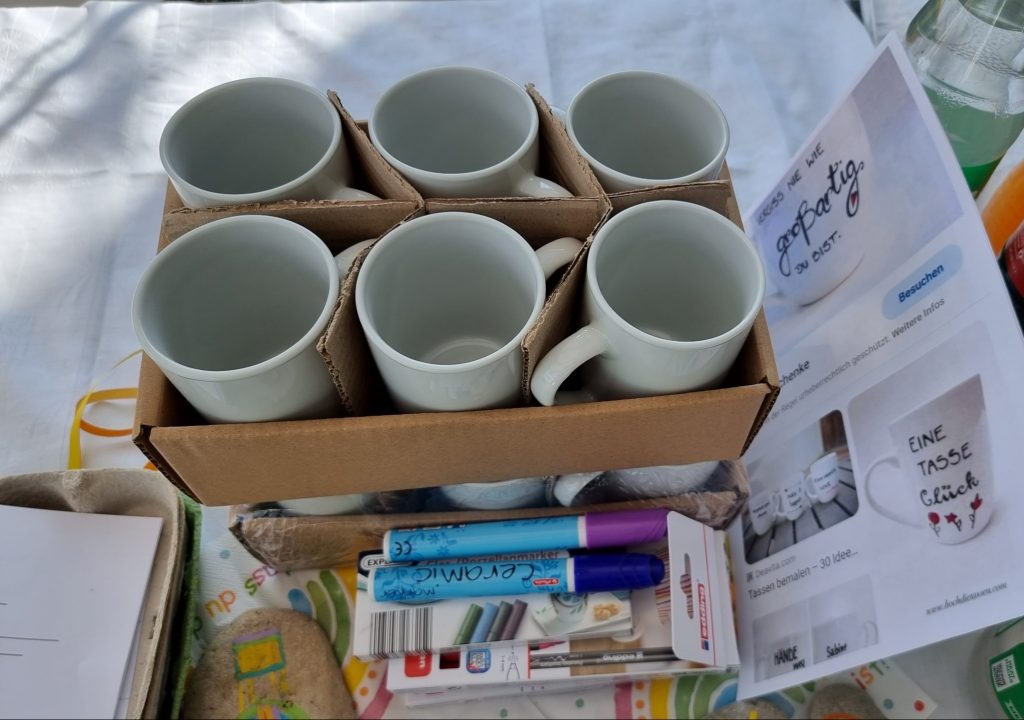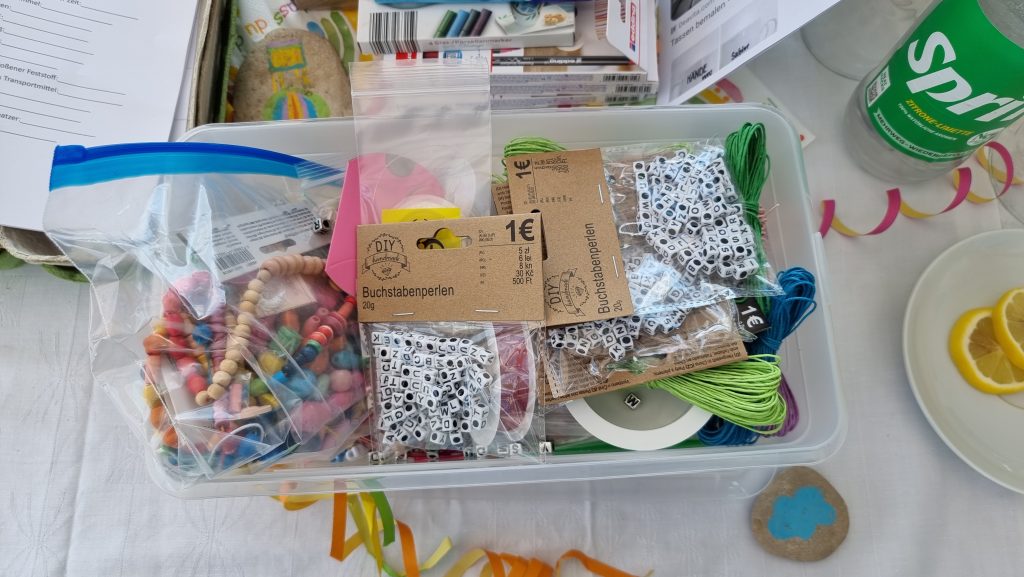 Da ich nur einen Becher pro Gast hatte, gab es noch eine Kiste mit Perlen usw. für Armbänder – das kam auch gut an.