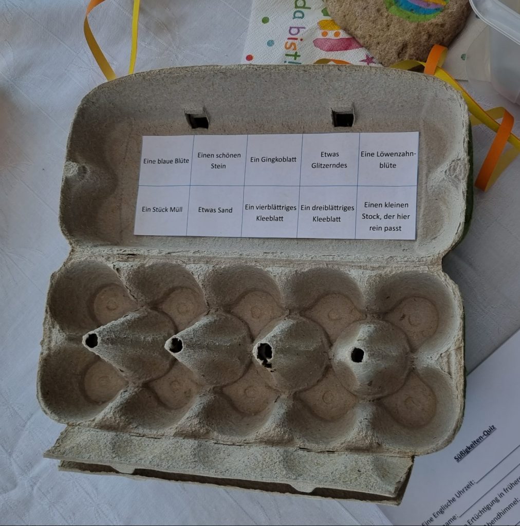 Da wir Kinder aus verschiedenen Gruppen und sogar vielen verschieden Schulen zu Gast hatten, die sich zum Teil auch gar nicht kannten, habe ich die „Spiele“ so organisiert, dass man immer zwischendurch (also zwischen Pool, Basteln und riesige Kletter-Hüpfburg) ein oder zwei Sachen alleine oder in einer selbstgewählten Kleingruppe machen konnte. Das war eine gute Idee, manche Kinder hatten sich seit der Grundschule nicht mehr gesehen und fanden es super, was gemeinsam zu machen. So kommt man auch leichter miteinander ins Gespräch. Hier haben wir aus einem Eierkarton ein Gartenbingo gemacht. Das Vierblättrige Kleeblatt musste aber nicht mühsam gesucht werden, ich hatte auf der Fensterbank im Wohnzimmer noch eins von Silvester mit ausschließlich 4 Blättern.