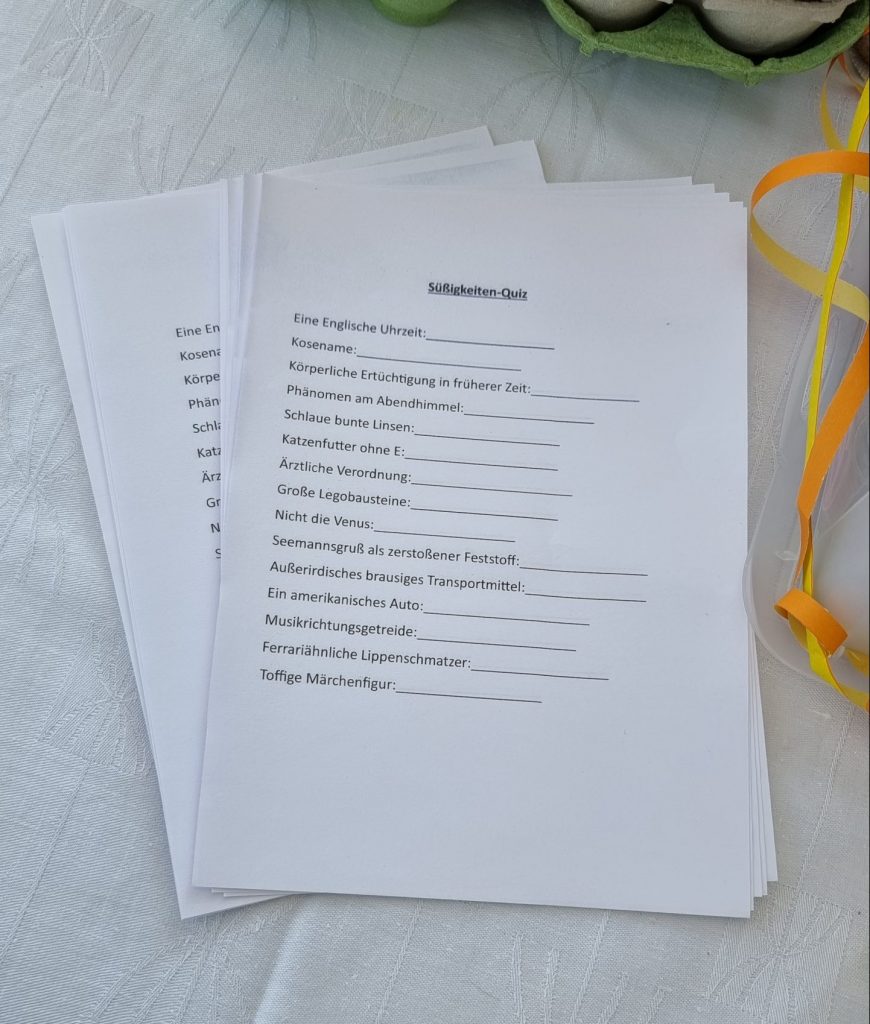 Ein Quiz über Süßigkeiten. Das fand ich auch total witzig und passend, so allgemeine Wissensfragen für 12jährige sind ja schwierig und es soll ja auch immer noch Spaß machen. Nicht jeder hat ja immer ein Handy dabei. Ich würde aber behaupten, bei Süßigkeiten kennen sich alle aus. Vorher habe die ganze Familie mit meinen Fragen genervt. Einiges hatte ich aus dem Internet, aber dann hab ich mir auch noch selbst was ausgedacht.