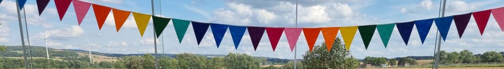 Hier habe ich (für die Einschulung noch) eine fertige Wimpelkette aus Filz gekauft und dann auf einen Bindfaden aufgezogen, das ist zwar etwas Arbeit, aber so ich konnte auch nicht passende Farben einfach weglassen. Wenn ich den Filz in den ganzen Farben gekauft hätte, wäre es sicher teurer geworden.
