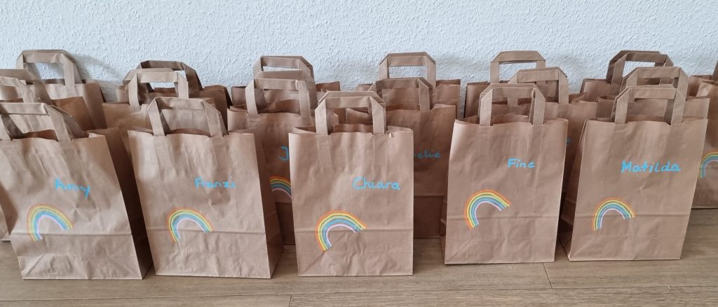 Über Partytüten am Ende freuen sich wirklich Kinder jeden Alters. Es war jetzt auch nicht so viel drin – was ich aber immer sehr praktisch finde ist, wenn die Kinder ihre selbstgebastelten Becher oder Armbänder schon mal im Lauf der Party einpacken können. So stehen die Tüten auch immer bei uns auf der Treppe, so dass jeder Gast immer an seine Tüte kommt. Herumliegende Haarspangen, Schals, Ohrringe, usw. können dann gleich auch von mir in die entsprechende Tüte einsortiert werden.