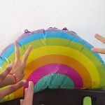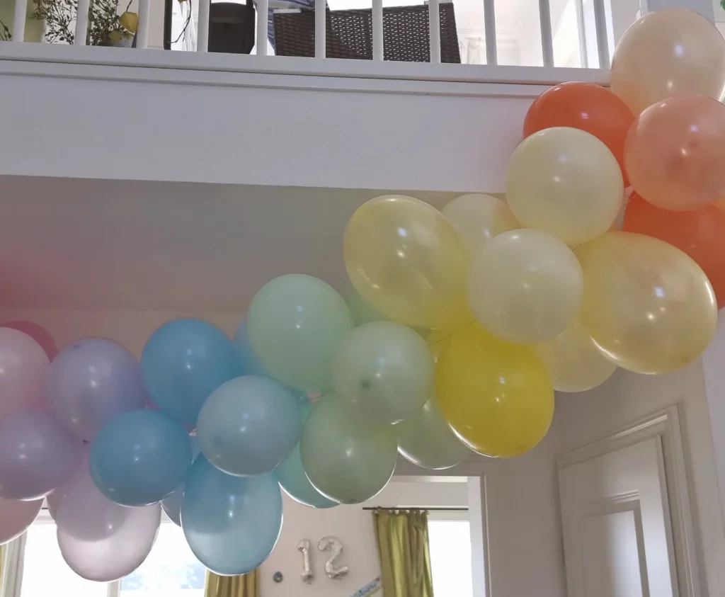 Emilia hatte sich eine Luftballongirlande gewünscht und das war auch gar nicht so kompliziert: ich habe erst immer drei Luftballons mit einem einfachen Gummi zusammengebunden (es geht aber auch mit zwei) und dann um eine Schnur, den Abstand so wie es hinkam. Da ich immer viele Luftballons zuhause habe, habe ich auch erstmal genommen, was ich an Pastellfarben hatte, aber ein paar kräftigere hab ich dann doch für den Kontrast eingebaut.