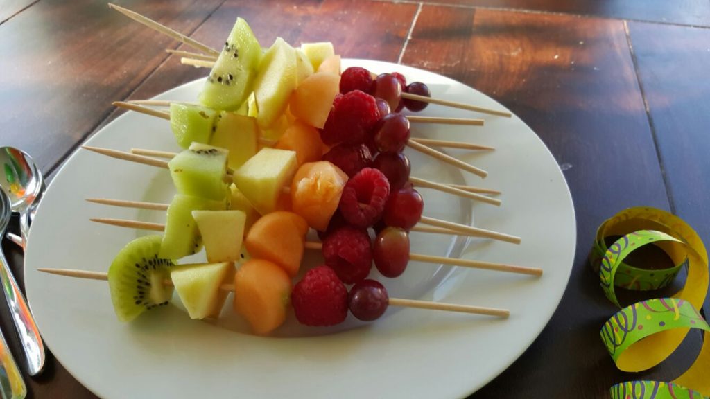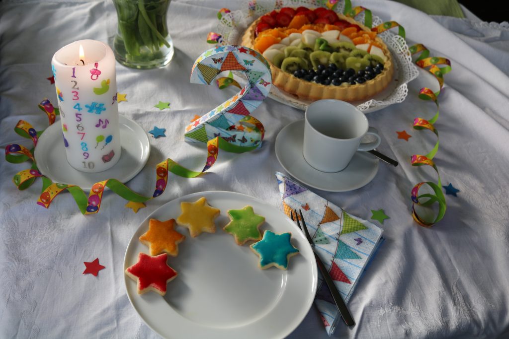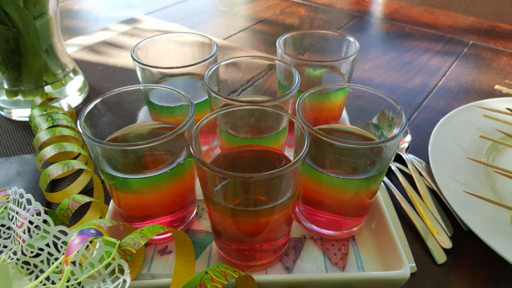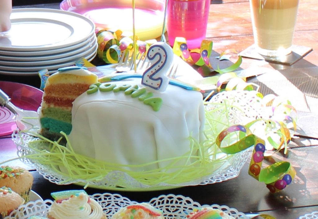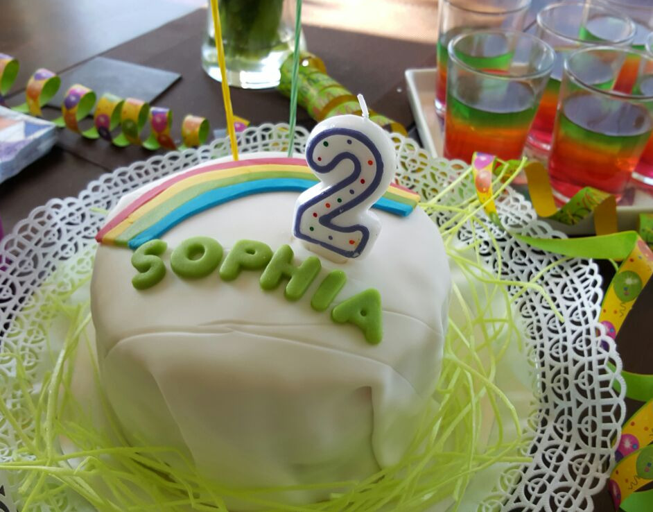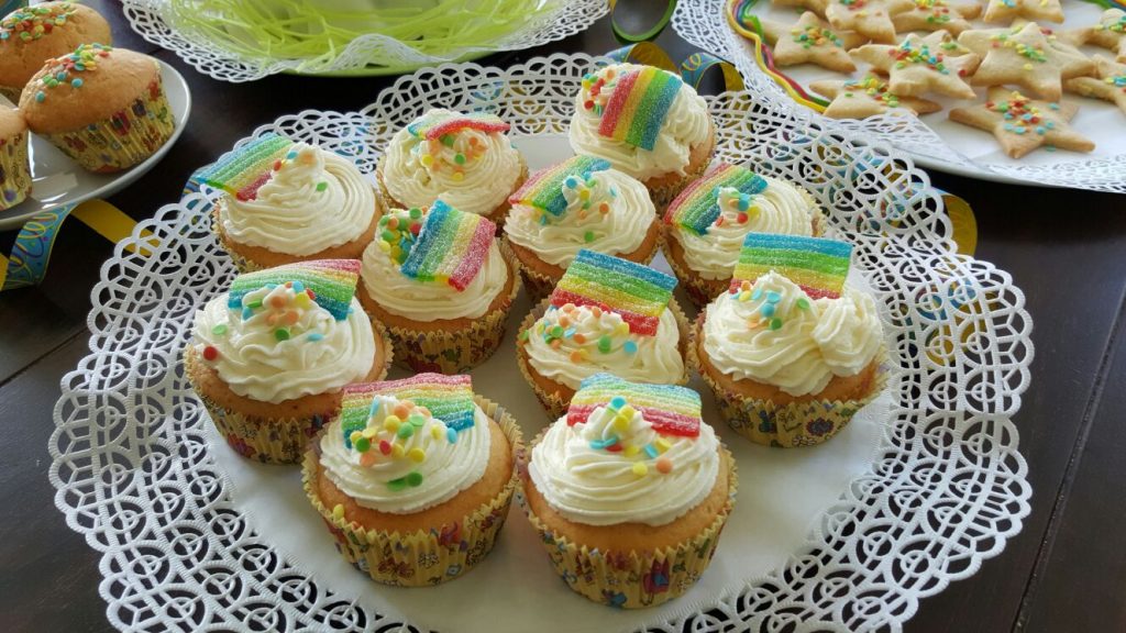 Kindergeburtstag Motto „Regenbogen“ / 2016 Das Thema zum zweiten Geburtstag stand relativ schnell fest: meine kleine Tochter mag und malt sehr gerne bunte Farben. Unbedingt erforderlich ist natürlich die Regenbogentorte mit den in Regenbogenfarben eingefärbten Schichten. Einfach, aber sehr dekorativ auf der Kuchentafel: Cupcakes mit Regenbogendeko Die meisten Kinder mögen total gerne Obst, hier greifen aber auch die Mütter gerne zu. Nochmal eine Muffinvariation mit einem Regenbogenfrosting. Die Idee habe ich hier gefunden: https://backen.de/rezept/grosse-regenbogen-cupcakes Sehr beliebt ist auch immer Götterspeise: hier nach und nach übereinander geschichtet: hier sollte man rechtzeitig mit den Vorbereitungen anfangen. Sehr lecker und dekorativ: einfache Kekse mit Zuckerguß in verschiedenen Farben und ein einfacher Obstboden mit entsprechen buntem Obst belegt.