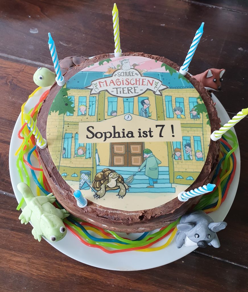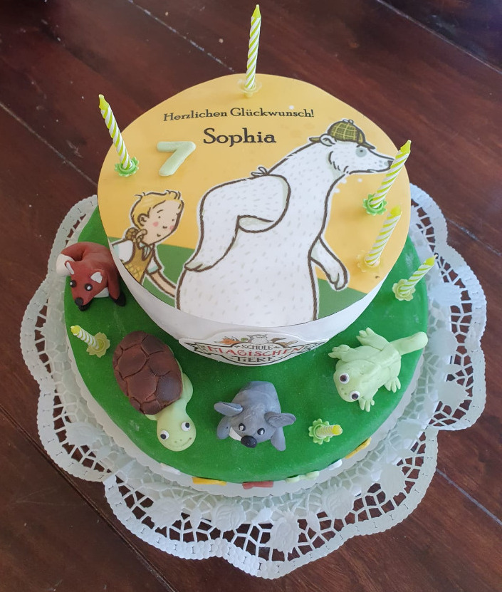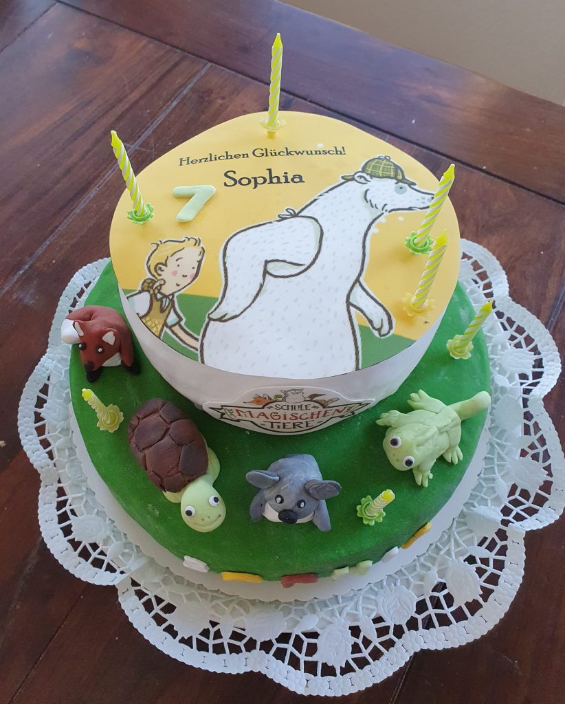 Für die Geburtstagstorte habe ich Sophias Lieblingsmagische Tiere aus Fondant geformt (vorher mit Knete geübt) und das obere Bild- sie wollte unbedingt ihren Liebling den Eisbären auf der Torte habe, ist ausgedruckt.