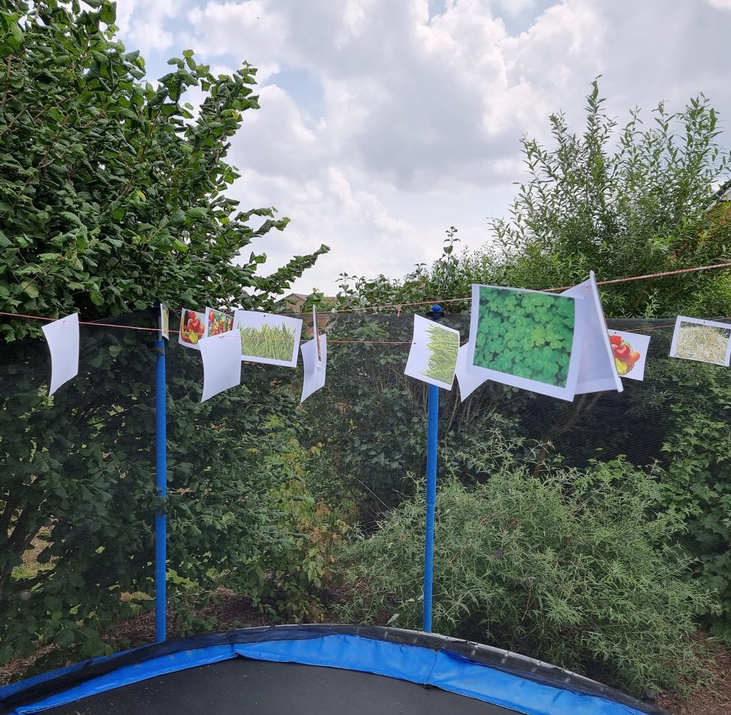 Die Spiele waren für beide Gruppen gleich, nur die Reihenfolge eine andere. Nach jeder gelösten „Aufgabe“ gab es einen Buchstaben. Hier hatten wir auf dem Trampolin Fotos mit dem Futter der Tiere aufgehängt. Die Kinder mußten einzeln springen und jeweils einen Zettel abreißen. Das sieht ganz einfach aus, war aber gar nicht so leicht.