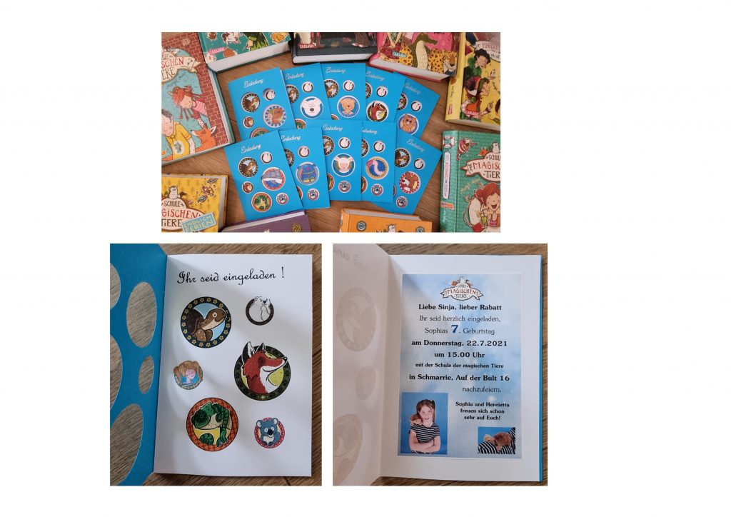 In Vorbereitung der Feier habe ich mir von allen kleinen Gästen, Cousins und Cousinen Fotos und den Namen und ein Bild ihres Lieblingskuscheltieres geben lassen, um für die Einladung und die Party alles vorzubereiten. Dann habe ich die Kuscheltiere im Stil der magischen Tiere gemalt, sofern es noch keine Bilder der Tiere aus den Büchern gab. Die Tiere der unteren Reihe sind Original aus den Büchern, bei den anderen habe ich mich dann versucht…