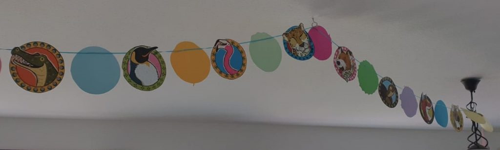 Ganz wichtig ist bei uns die Partydeko: hier habe ich mir einfach Bilder aus dem Internet ausgedruckt, auf Pappe geklebt und mit Heißkleber an ein schmales Band. Immer abwechselnd ein Tier und das entsprechende Kind auf der anderen Seite dazu. So ist es gleichzeitig auch ein Ratespiel: wer gehört zu wem.